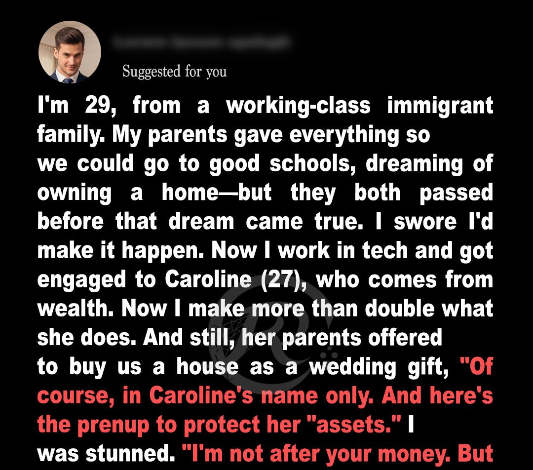 Her parents said the house would be in Caroline’s name only. No shared title. No recognition of my contributions. That already stung — like they didn’t trust me at all. Then they dropped the bomb: a prenup designed to lock me out of everything.
