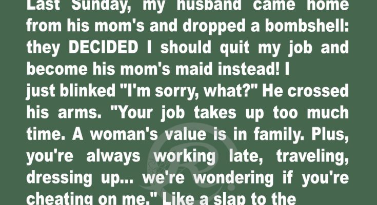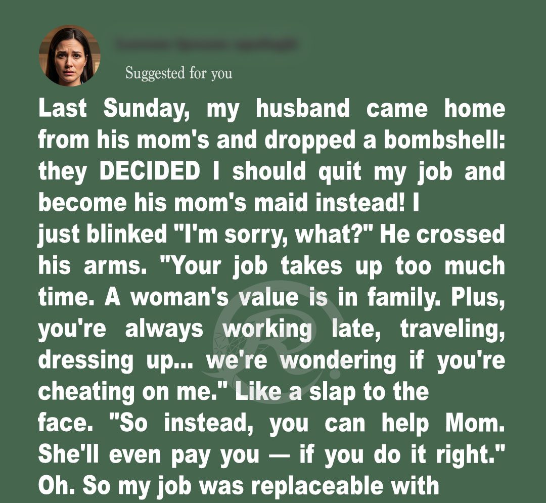 Ethan walked in, took a deep breath and said, “We need to talk… Mom and I decided you should quit your job.” I stared at him in disbelief. He explained that “family” was more important than my work, and that I should stay home to take care of things around the house — for both of them.