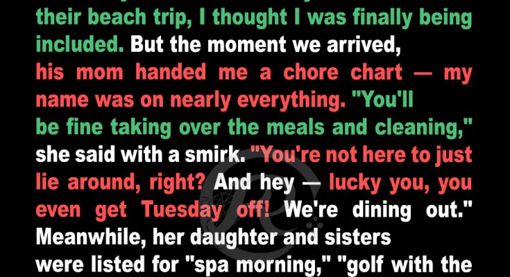 When Tess agreed to join her husband’s family for a beach vacation, she imagined sun, sand, and laughter. Instead, she was handed something no one expects on day one: a laminated chore chart — with her name plastered all over it.