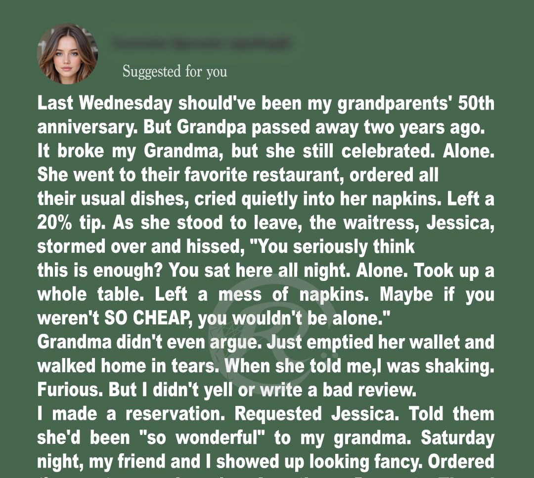 “To our waitress, Jessica. Not just for service tonight, but for the way you treated my grandmother — a widow celebrating 50 years of love.”