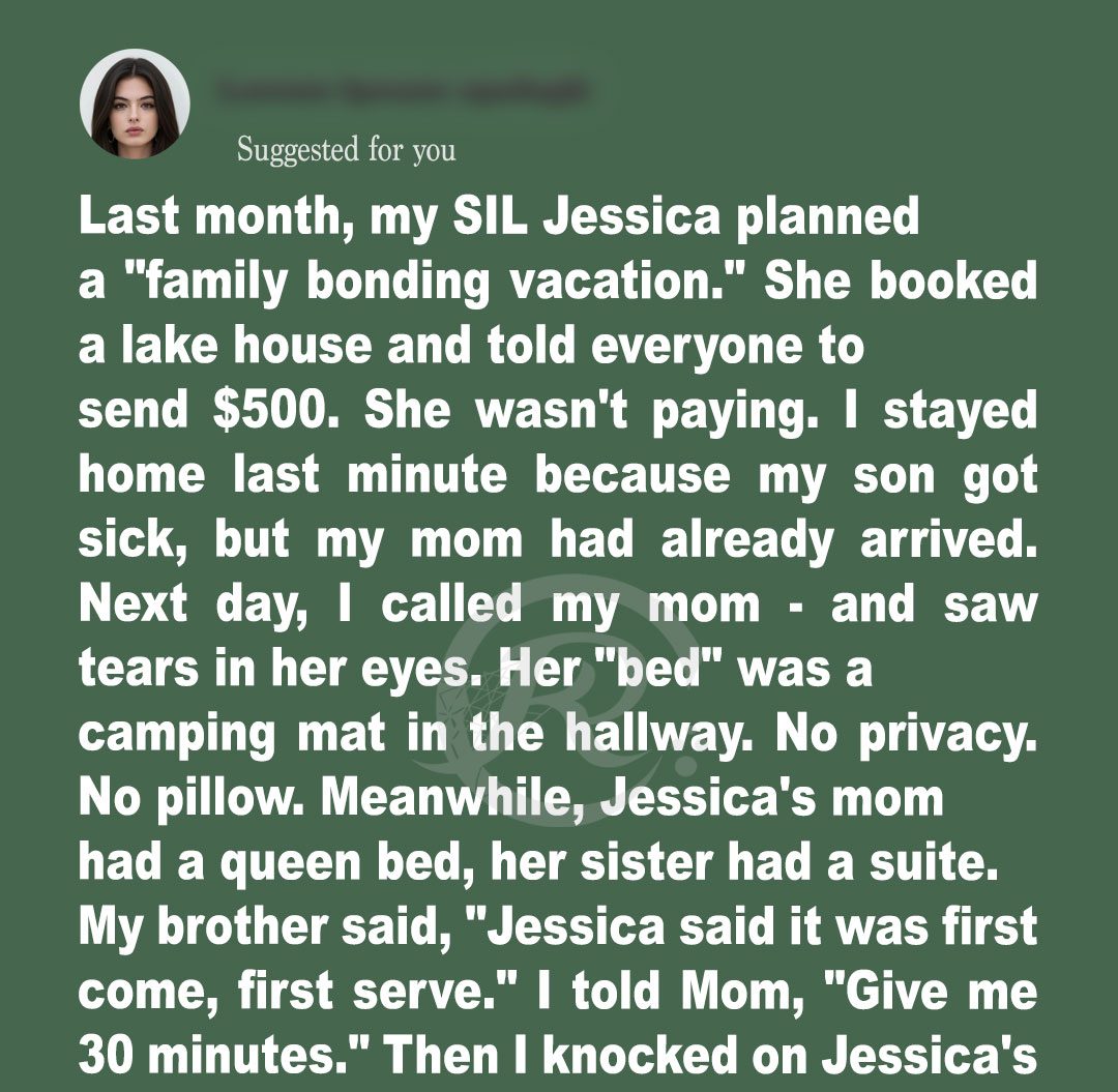 What started as a sweet family getaway quickly turned into a showdown I’ll never forget. When my sister‑in‑law, Jessica, announced a “dream family vacation” at a lake house, my mom was thrilled — she even paid her $500 share with pure excitement, eager to spend quality time with children and grandkids.