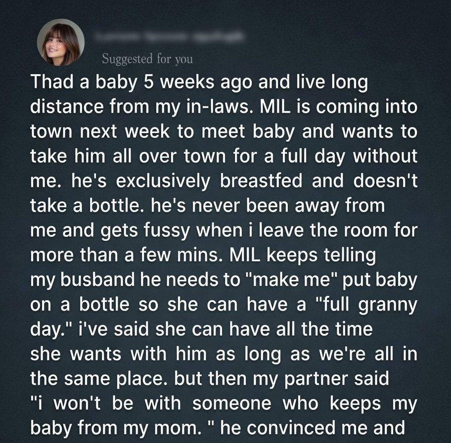 Days later, things escalated again. She tried to interfere directly—offering formula behind my back, questioning my choices in front of others, even implying I was being selfish.