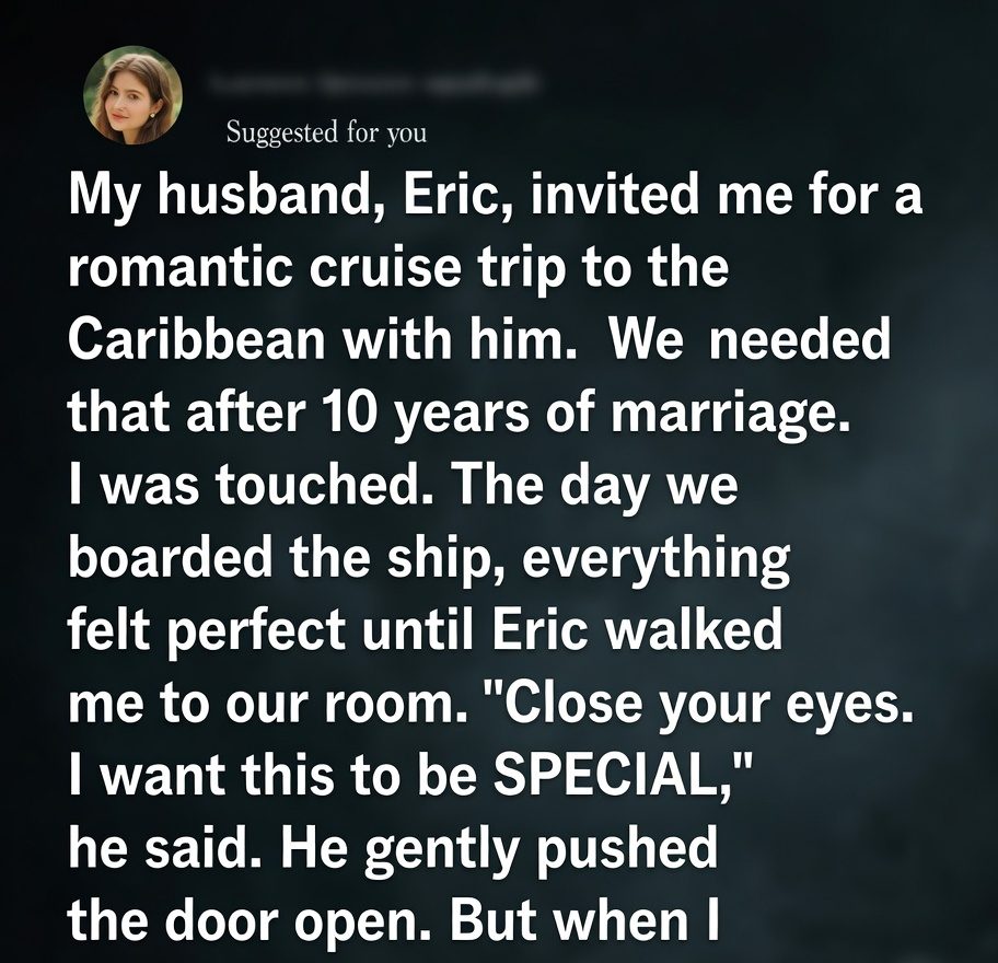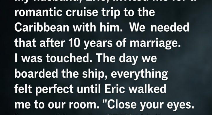 We boarded the ship. Champagne, ocean breeze, turquoise water — it felt like a postcard. Eric’s grin was a little too wide, his hand a little too tight as he led me down the hallway to Cabin 724. “Close your eyes,” he whispered. I laughed and obliged.