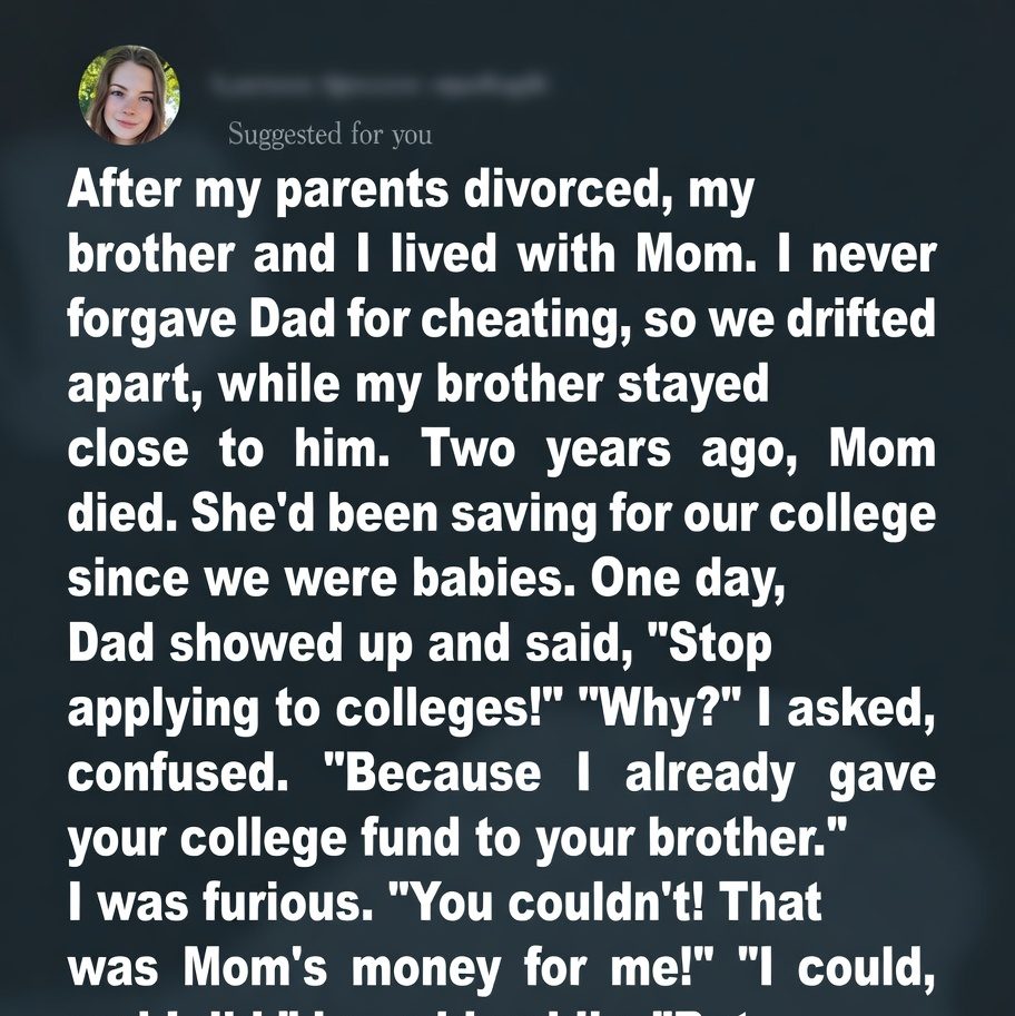 When Dad told me, he didn’t even look me in the eye. “I already gave your college fund to your brother,” he said flatly. “He deserved it more — because you didn’t love him. Because you reminded him of your mom.”
