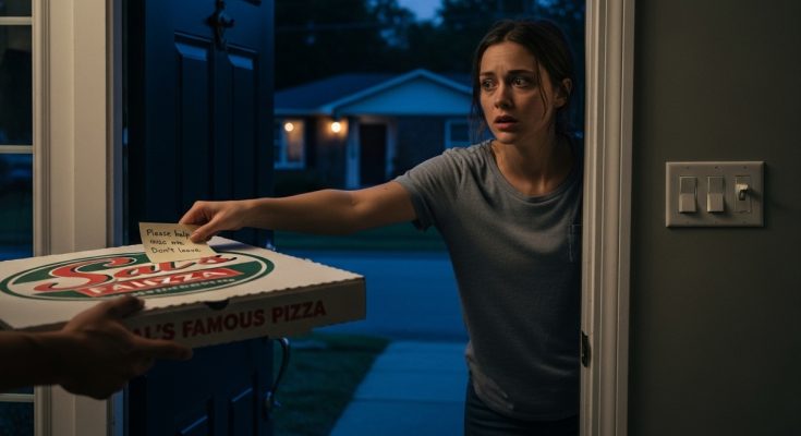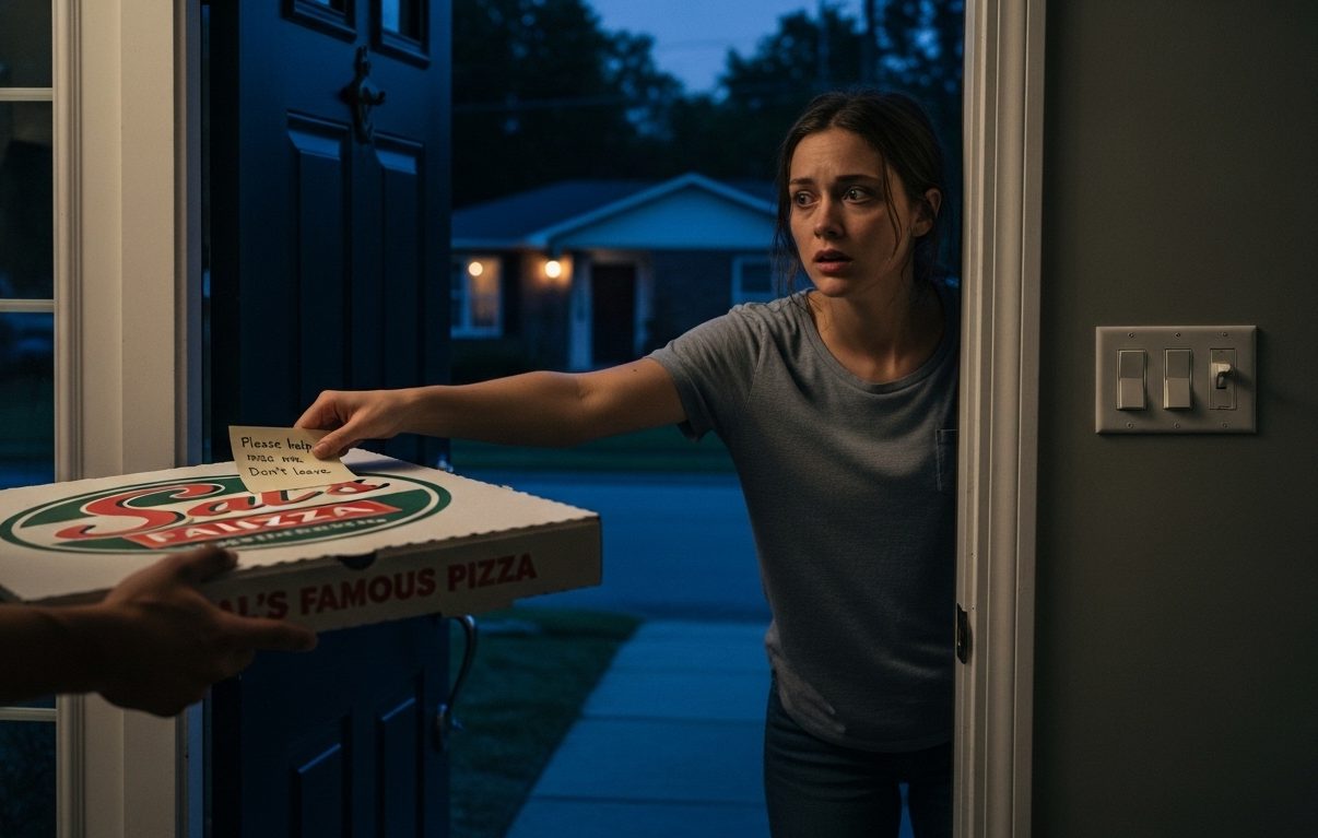 “I slipped the note under the pizza box so fast I thought my mother-in-law would catch me: ‘Please help me. Don’t leave.’ When the delivery driver glanced down and heard her snap, ‘She doesn’t need a phone, she needs discipline,’ his expression shifted. I had spent months cut off from anyone who might believe me. I didn’t realize then that a stranger at my front door was about to become the first person who finally did.”