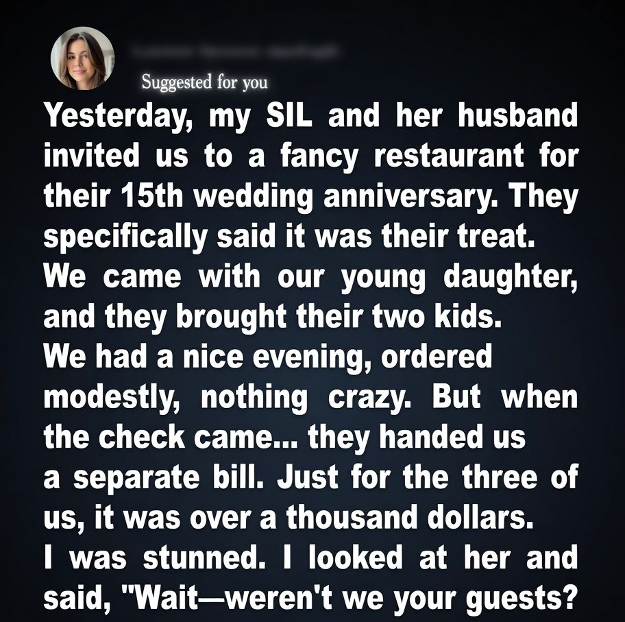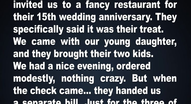When my sister‑in‑law invited my family to celebrate her anniversary, it sounded like a sweet, generous gesture — until the check came. What unfolded was a mix of shock, frustration, and a lesson she’ll never forget.