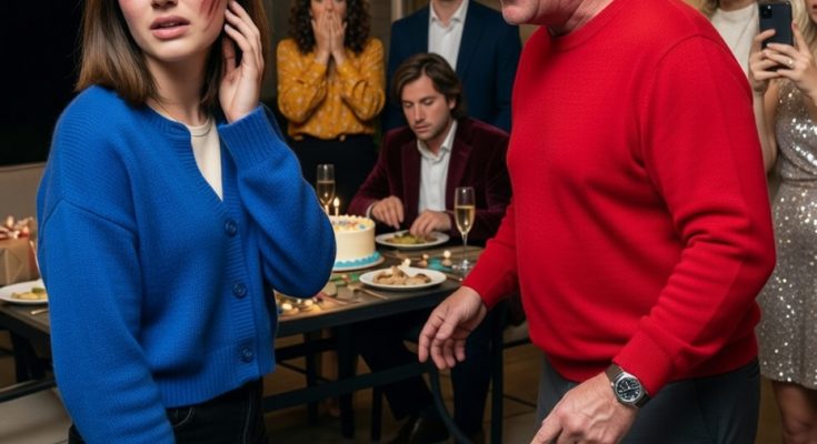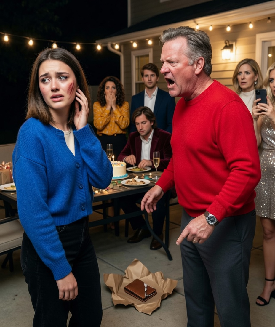 The sound cracked across the patio so sharply that every conversation stopped at once. One second I was standing there with the craft-paper package still half-open in his hand, and the next my face was burning, my head turned sideways, and a champagne glass had slipped from someone’s grip and shattered against the flagstones near my shoes.