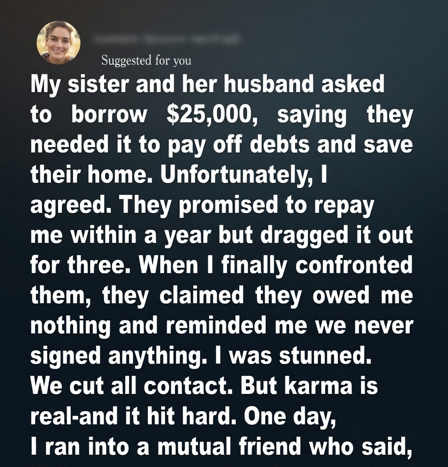 For six months, I said nothing. I wanted to believe they’d come back when they were ready. A year passed. Then another. When I eventually asked about repayment, their excuses were vague — “tough quarter,” “kids’ tuition.” Meanwhile, Lisa flaunted weekend getaways and Rick showed off a brand‑new SUV.
