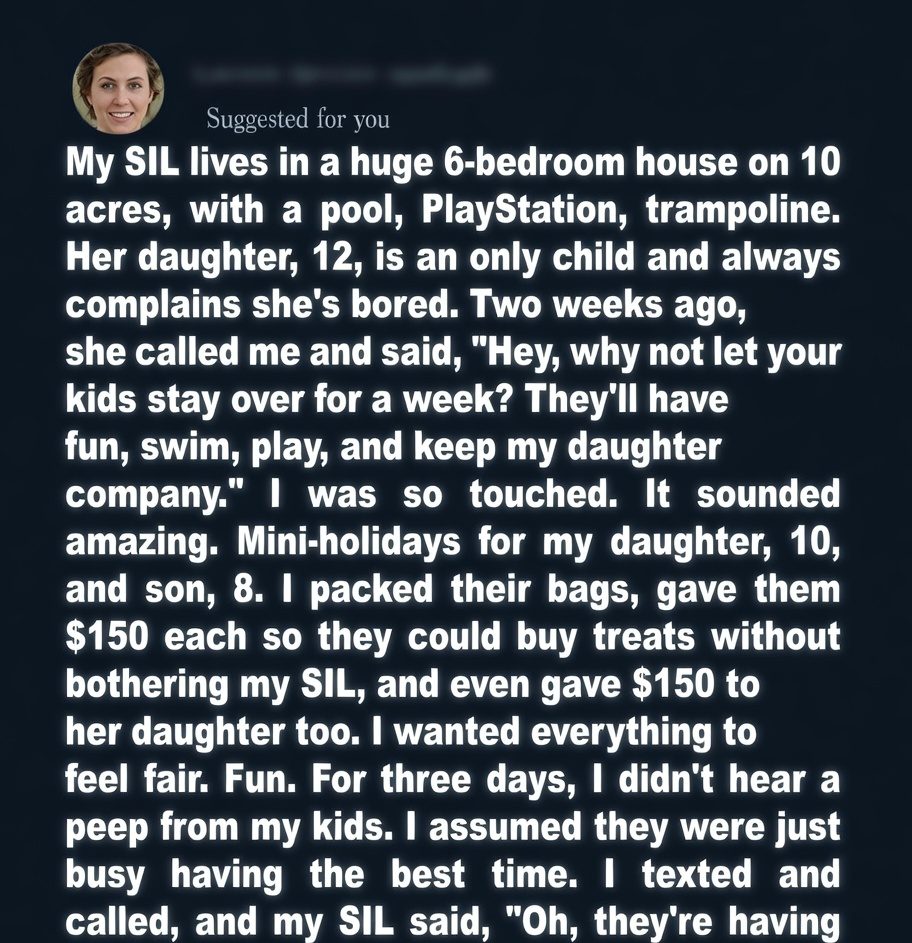 When my sister-in-law offered to host my kids for a full week at her sprawling mansion complete with a resort-style pool, games, and endless treats, I genuinely believed it was a dream summer vacation. But after days of eerie silence and one chilling text from my daughter, I raced over unannounced… and what I witnessed in her backyard left me frozen in shock.