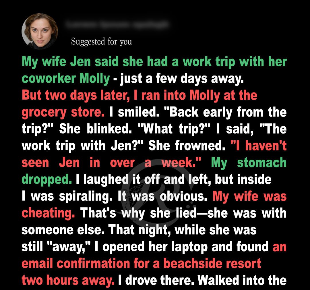 My wife, Jen, came home one evening and casually told me she had a work trip coming up — a few days away with her coworker, Molly. Something about it felt off, but I trusted her. I figured she was just nervous about the travel. But I had no idea how wrong I was.